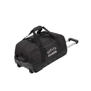 Featuring embroidered Harley-Davidson graphics along the side . Water-resistant, durable polyester-blend twill construction. Construction features include top-zip access to the main compartment, front horizontal-zip accessory pocket, hidden telescoping pull handle, removable shoulder strap, carry handle with handle wrap, fixed handles at both ends, two compression straps covering the top zipper and in-line skate wheels. Fits in most commercial airlines overhead compartments.