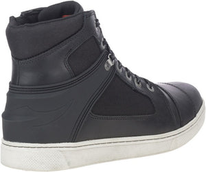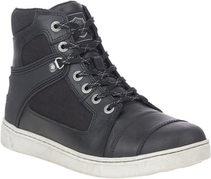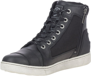 Made with full-grain leather with textile panels, lightweight rubber outsoles, an inside locking zipper, and subtle Harley-Davidson branding. These boots have a grab and go style. These moto sneakers are designed to shift with you, from your motorcycle to your place of work, or while enjoying life in all its many forms. They are protective. Full-grain leather and textile panels provide durable and scratch resistant coverage against debris and abrasion. They are versatile. A full-length mesh lining provides all day comfort. Poron is built into the boots – it’s comfortable, flexible and lightweight while absorbing more than 90% of energy when impacted at high strain rates. An ankle stability overlay provides additional protection. The toe box has an additional layer of leather for longer wear. With YKK® locking inside zippers, you step-in, tie-off, and you are out the door. A Bar & Shield® logo is sewn onto the padded tongue, and the cuff is also padded for maximum comfort while riding, standing, or walking. The street-side outsole features a bright orange Bar and Shield® logo. The boot's sole, insole and upper are bound using state-of-the-art cement construction processes. With an abrasion, oil, and slip resistance rubber outsole, these boots are ready for anything. Subtle branding with a classic sneaker silhouette, these boots are built for the ride, and very wearable on the street. For riding or strutting around town, the Gilmore will get where you want to be. Shaft height: 5", Heel height: 1".