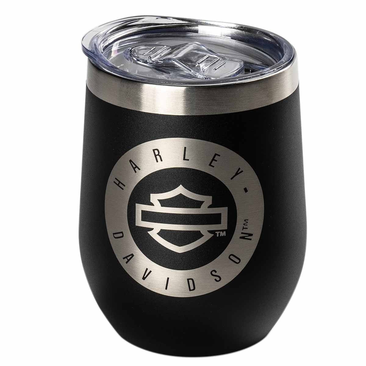 Keep your drinks chilled with this stainless steel stemless wine tumbler. Semi-matte black finish with laser engraved Open Bar & Shield logo. Vacuum insulated. 450ml