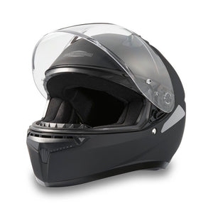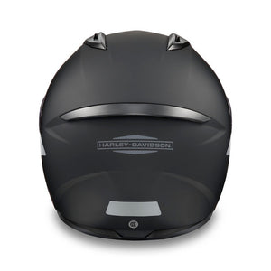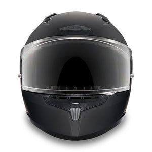 Constructed from polycarbonate composite with a double d-ring chin strap this Harley-Davidson helmet is the ever popular matt black. Features: Lightweight, superior fit and comfort using advanced CAD technology. Face shield is Anti-scratch coated and provides 99% UV protection. Rear spoiler reduces drag. Bluetooth specifications: Speaker pockets for Bluetooth systems (headsets sold separately). Removable and washable moisture wicking comfort liner.  Glasses grooves accommodate eyeglasses and sunglasses.  Advanced Channeling Ventilation system promotes front-to-back airflow to flush out heat & humidity. Average Weight: 1,525 grams (+/-35g)