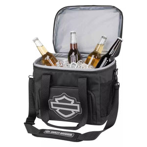Grab this Harley-Davidson cooler for your next outing. With leakproof body and zippers it holds 24 cans and has side and front pockets for those little extras you need at the last minute. Carry handles along with a removable carry strap, features Harley-Davidson graphics on the front and carry strap.