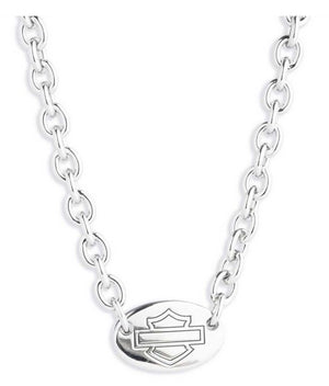 Featuring the Iconic Bar & Shield logo oval on the pendant. Crafted from high-quality brass with silver plating. Adjustable 16" chain with a 3 inch extender. This stunning necklace is the perfect accessory for any occasion.