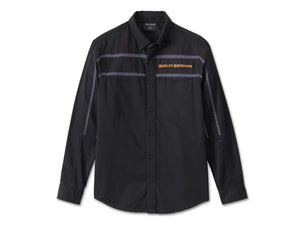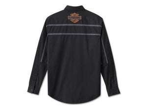 Relaxed through the body and featuring a hidden chest pocket with embroidered Harley-Davidson graphics o the left chest and the iconic Bar & Shield on the back yoke. This long sleeve Men's shirt is washed for softness and hits below the waist for length.