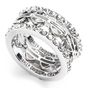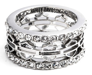 Consisting of a set of 3 stackable rings. Two stunning bands accented with crystal stones and the open Bar & Shield featuring in the middle ring. Crafted from high-quality brass with silver plating. These gorgeous rings are yet another must-have to add to your H-D collection.