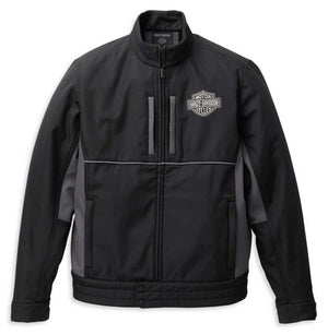 Super smart this Men's windproof woven polyester jacket features adjustable cuffs and waistband, plus a hit of reflective piping for added visibility. Contrast piecing for added style and the iconic Bar & Shield on the left chest. Made from 100% woven polyester with windproof material. Zippered front. Zippered hand-warmer and chest pockets. Adjustable cuffs and snap-tab waistband.