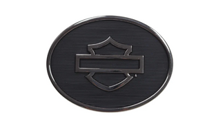 Finished in black finish, with a silver raised Open Bar & Shield and silver outline. This high-quality, heavy-duty buckle is built and ready for the ride. Classic oval shaped. Fits 38mm wide straps. Buckle size measures 3.25" x 2.75".