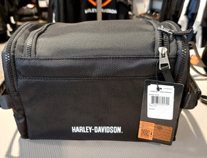 This travel toiletry bag features a top zip opening with two outer zip compartments. The interior features various small open compartments and one large compartment and a hook for hanging. A grab handle on each end makes it easy for carrying. The iconic Bar & Shield is printed on the front with Harley-Davidson graphics on the back.