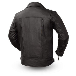 M/C style w/ snap down lapel, collar, and asymmetrical zipper. Two buttoned chest pockets. Two zippered slash pockets. Eight hidden utility pockets. Two conceal carry pockets w/ bullet snaps & tapered holsters. Zippered sleeves w/ gussets. Adjustable side belts. Underarm gussets. Action back. Insulated zip-out thermal liner. YKK zippers. Armored pockets for CE rated armor (shoulder / elbow and back)