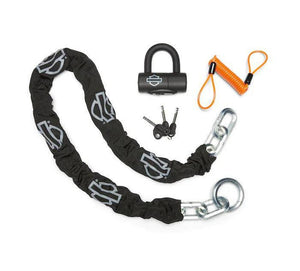 Maximum protection for your motorcycle. This high-security Loop Chain and U-Lock Kit features a 12mm triple heat treated Boron Manganese 6-sided link steel chain with cinch ring for securing your bike to stationary objects.