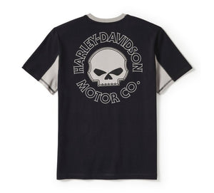Bold style meets legendary artistry in the Willie G Skull Colourblock Short Sleeve Tee. Crafted for longwearing comfort from heavyweight cotton jersey, this men’s t-shirt delivers a relaxed fit. Its contrast fabric piecing complements the fearless Willie G Skull graphics. Though the Skull is one of his most popular creations, Willie G. Davidson also designed several motorcycles, including the 1971 FX Super Glide® and the 1977 FXS Low Rider®.