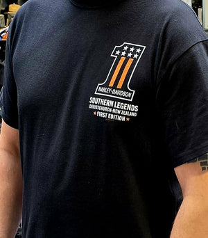 Be the proud owner of the First Edition Southern Legends Harley-Davidson Tee. The front features the H-D #1 with Southern Legends, Christchurch, New Zealand, First Edition on the left chest. The back is a large print featuring the iconic Bar & Shield and Southern Legends Harley-Davidson, Christchurch, New Zealand. Get yours now!