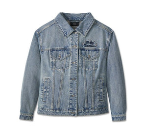 This all-cotton denim build Ladies Studded Out Embellished Denim Jacket is bleached and distress washed for a well-worn vibe. Its oversized trucker silhouette features an adjustable button-tab back waistband and hidden snap-down collar that won’t flap around under riding gear. But what gives this women’s jean jacket its head-turning looks are the Harley-Davidson embroidered seasonal graphics adorned with silver studs and rhinestones.