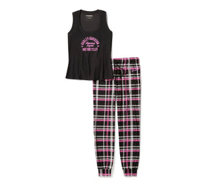 Snooze or relax in Harley style with this Plaid Pajama Pant Set. These women’s pajamas are crafted for coziness from polyester jersey with a hit of spandex for added stretch. The sleeveless top features set-in trim and a flattering neckline. The pants have side seam pockets, a drawstring waistband, and cuffed leg openings. The attractive plaid bottoms complement our 1980s-inspired graphics on the top. These are super soft and super comfy, be quick these are a limited release and we have limited stock.