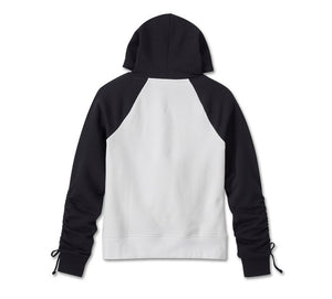 Hoodie comfort gets a style upgrade in this Limited Issue. Made from cotton/polyester fleece, that's super soft and cosy the Simmering Bar & Shield Hoodie features contrast raglan sleeves and hood plus sleeve ruching to elevate its look. This women’s long sleeve fleece is branded with a gorgeous gradient print from the fiery seasonal color palate. Order now while supplies last.