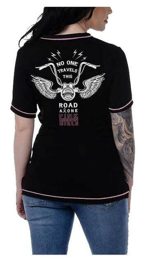 This beautiful tee expresses your love for the Pink Ribbon and Riding all in one. It has graphics front and back with rhinestone embellishments. and pink contrast stitching.
