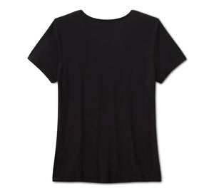 Earn your wings for fiercely beautiful style in this special-issue Bling Dark Angel Short Sleeve Laced Front Tee. Crafted from a 225-gsm cut of super soft rayon jersey with a hit of spandex for added stretch, it features an attractive V-neckline with crisscross lacing and metal grommets. This women’s tee is finished with a striking wingspan design layered with rhinestones. Get yours ASAP before they are gone