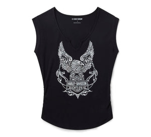 Your moto-loving style soars in this Bling H-D® Born to Fly Notch Neck Tee. This special issue is built from a 225-gsm rayon jersey for a super soft feel and longwearing comfort with a hit of spandex for added stretch. Designed to flatter your figure, this women’s sleeveless t-shirt features a scooped, notched neckline and side seam rouching. Its exclusive, rhinestone artwork is inspired by the H-D circa 1976 Bar & Shield eagle design created for the U.S. Bicentennial. Add this to your wardrobe before it’s too late.