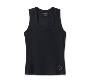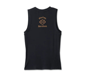 Stay cool and committed to H-D style in this Limited-Issue Old English Tank. It’s cut from a ribbed cotton/modal mix for softness and breathability with a hit of spandex for added stretch. This women’s tank top has a slim-fitting silhouette to flatter your figure with set-in trim at the neckline and armholes to help keep its shape. Finished with the open Bar & Shield graphic on the front and a larger hit of graphics on the back. Snag yours while supplies last.