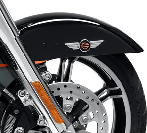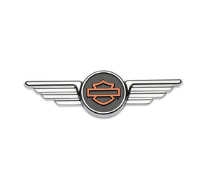 •Brilliant chrome wings flank a centered black and orange Bar & Shield logo