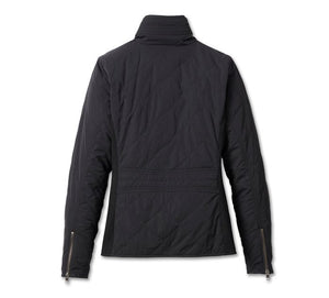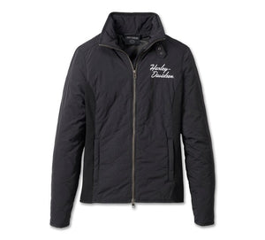 Stylish outerwear gets a hit of Harley pride in this Milwaukee Quilted Jacket. Crafted for warmth in chilly temps from a rugged blend of nylon taffeta and polyester with rib-knit side panels for added comfort and stretch. Features a sturdy two-way zip front, zippered sleeves, and an interior pocket to stash your essentials. Its stylish finishes are the real story here, with diamond quilting, multi-track stitching on the shoulder and back waist, and a distinctive metal buckle collar. Finished off beautifully with an embroidered Harley-Davidson graphic on the left chest.