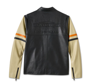 With a contrast front yoke and sleeves the City Limits Leather Jacket will take you everywhere even off the bike. It is made from midweight cowhide with a 100% nylon lining . Featuring an action back for ease of movement, two way zipper front (zip the bottom zip up a inch or two and this stops your jacket riding up while you are enjoying your ride). Welt hand-warmer pockets with zip closure and an interior welt chest pocket with a hidden snap closure. Finished off with direct Harley-Davidson graphics on the front and back with a small embroidered patch on the left chest. Grab yours before they are gone - strictly limited edition and limited stock.