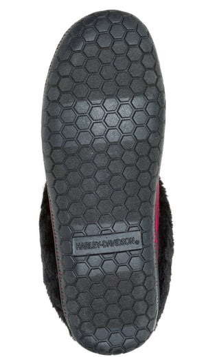 These slippers are made for year-round wear, and are especially perfect for the winter – warm and comfy-cozy. Featuring a classic embroidered Harley-Davidson Bar & Shield on a soft black and red plaid design. These slippers are perfect for relaxing and strolling around the house, and are also suitable for the occasional trip to the mailbox or to fetch the morning newspaper. The style is classic with that special Harley touch. The uppers are finished with a plush faux fur, as is the lining. This means all-day comfort for your feet. If you are looking for a perfect gift, this should also be at the top of your list. The outsole is rubber with a grippy texture, perfect for safely paddling around the house. The soles and the uppers are bound using cement construction processes. Wear with or without socks. Either way we think you’ll agree - when the shoes come off, it’s time for Harley slippers.