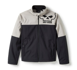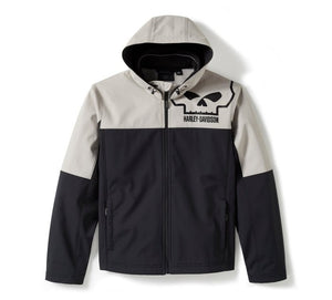 Stay warm and dry as you honour a creative legacy in the Willie G Skull Water Repellent Softshell Jacket. Made with water-repellent and windproof materials, it’s an ideal men’s outerwear pick for when the weather takes a nasty turn. It also features zip-closed pockets for securing essentials, a removable hood with toggle cord, and reflective graphics to enhance visibility. Its colour block style is boldly branded on both sides with the fearless Willie G Skull. Know the history—though the Skull is one of his most popular creations, Willie G. Davidson also designed several motorcycles, including the 1971 FX Super Glide® and the 1977 FXS Low Rider.
