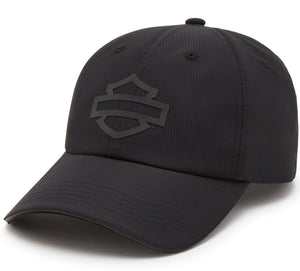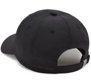Crafted from durable 100% polyester ripstop, the Harley-Davidson Men's H-D TECH Reflective Switchback Adjustable Baseball Hat offers long-lasting wear and resilience. It features an adjustable branded metal slider for a secure, customized fit. The reflective sandwich brim and high-density reflective print enhance visibility in low-light conditions, combining safety with style.