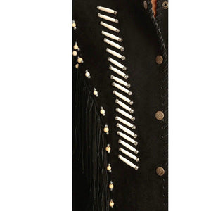 Made from supple leather suede with quality craftsmanship and modern western style, This women's jacket boasts a modest neckline with stand-up collar. Decorative brass-tone snap closures at the front placket. Featuring simulated bone bead down the front and round beads with silver balls down the front and back side seams. The interior is lined with an open interior pocket. If you love tassels then you will love this jacket in this western/biker style.