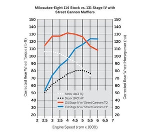 Go big or go home. With the largest displacement of any Harley-Davidson Stage Kit, this 114CI to 131CI Stage IV Kit was designed to deliver maximum horsepower – all the way to the redline. Packaged with patent-protected cylinder technology, it allows for the largest bolt-on engine upgrade to any Milwaukee-Eight motor. Features new CNC-ported heads with 1mm bigger valves and fully machined combustion chambers. Coupled with the kit's high-lift SE8-517 cam, high compression pistons and a 64mm throttle body and intake manifold, this combination delivers a thrilling 131 ft-lb of torque and 121 HP rear-wheel output when paired with Screamin' Eagle Street Cannon Mufflers. It’s designed to run wide open at high-end RPMs and provide a significant boost of torque from cruising speed. You’ll feel the difference as soon as you twist the throttle. When installed by an authorized Harley-Davidson Dealer within 60 days of the vehicle purchase, compliant kits do not impact the vehicle’s limited warranty. Kit includes: CNC Ported Cylinder Head with CNC machined chamber and 1mm larger valves, Stage IV Timer Cover, SE8-517 High-Lift Cam, Forged High Compression Pistons, High Performance Cam Bearing and Tappets, 4.31" Steel Sleeve Cylinders, 64mm Throttle Body and Cast Manifold and High Flow Injectors (5.5 g/sec).